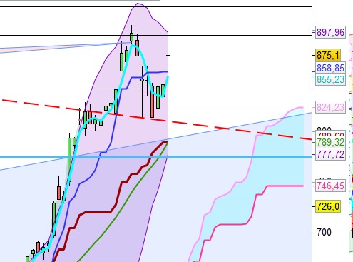 Maintenant, 1ere zone de support 815€ mais j’aime bien la zone de polarité 760€ qui est les 50% de retracement de Fibo de la dernière impulsion haussière et sa m10 hebdo