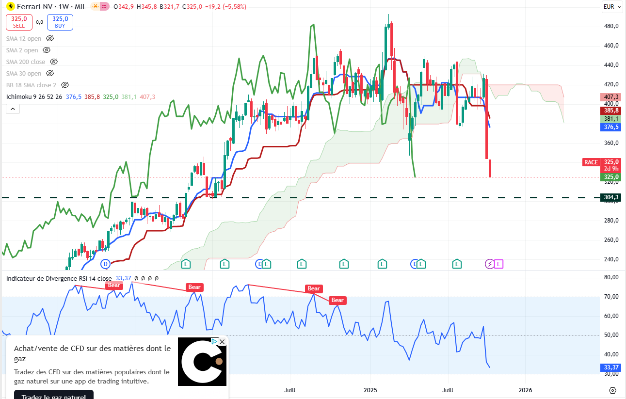 Pour Ferrari vu la déflagration, je pense que vers 300€ avec sa m200 et une belle zone si on bougie hebdo verte ou une grande mèche basse On est dans une belle tendance baissière qui a repris ses droits avec le franchissement à la baisse du support 344€