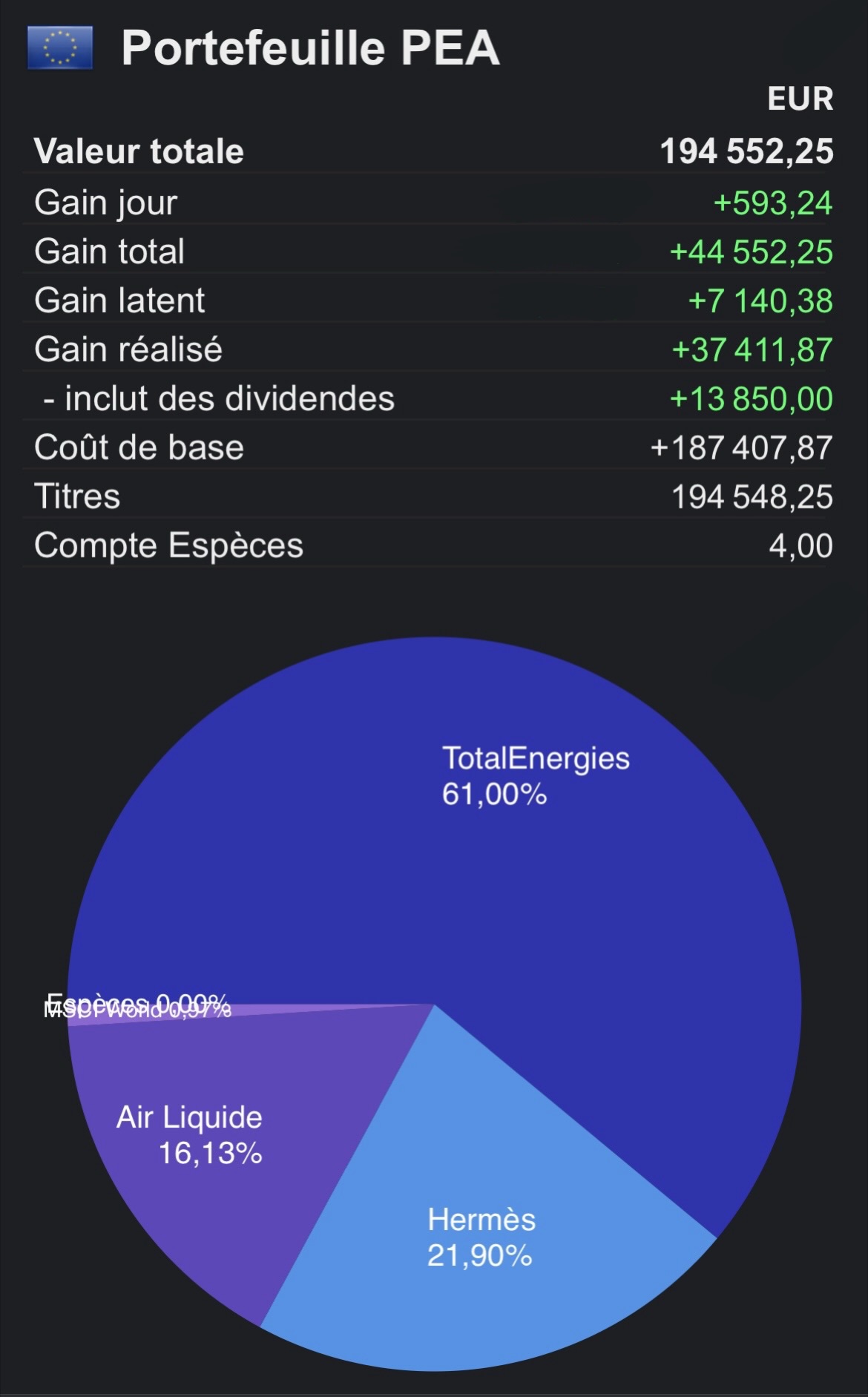 J’aimerais avoir vos avis concernant mon portefeuille PEA, sachant que mon objectif et de détenir des actions à dividendes afin de générer des revenus complémentaires qui seront complètement réinvestis (pour le moment).
