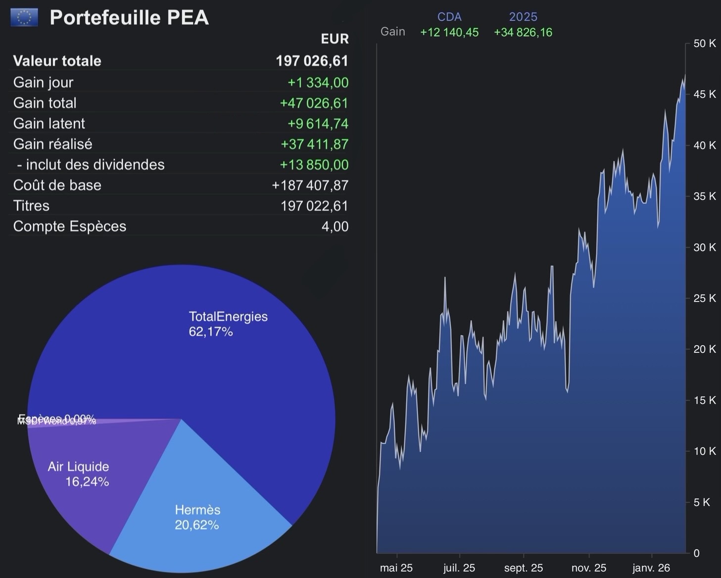 Jâai bascule une grosse partie du pea en etfs europeens et les perfs sont lađ€, je prends mes Pv progressivement sur total comme convenu, par contre câest vrai je nâai pas tenu le seuil mini des 200đ€Łmais la philosophie de prise de PV est respecteeđ