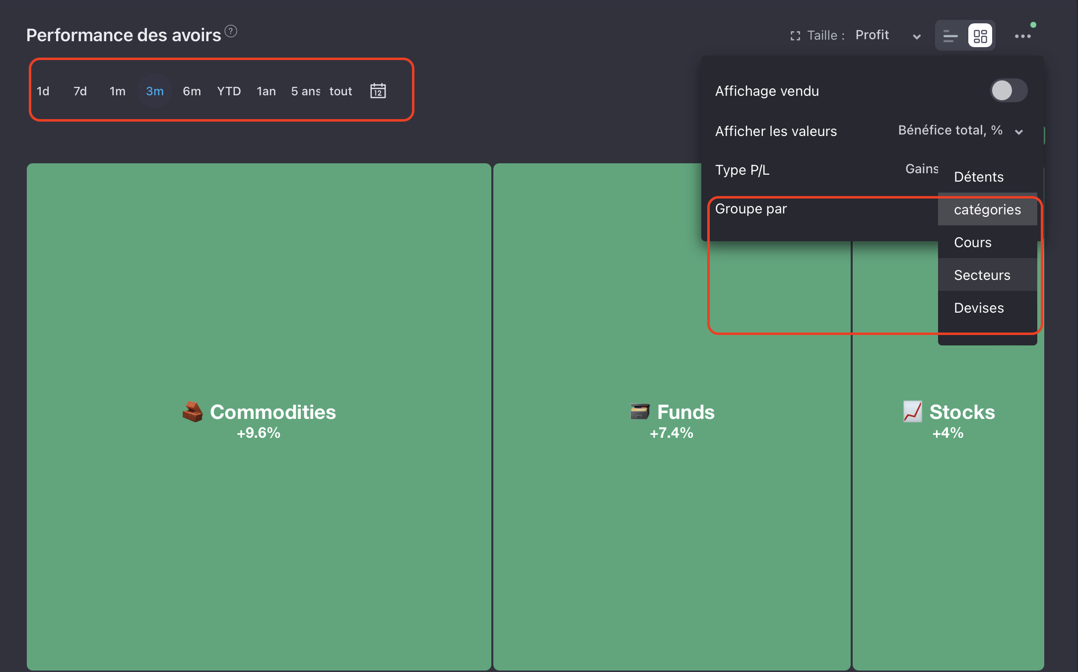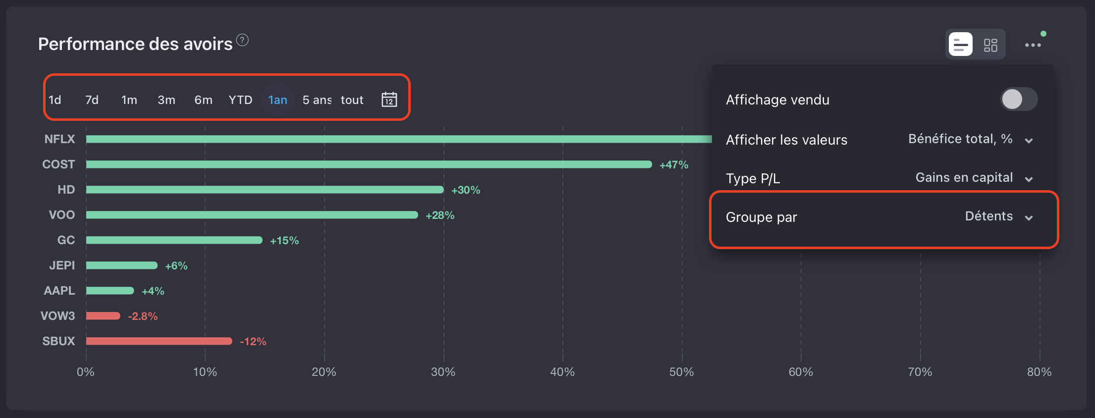 3 - Le graph de rendement est top avec la possibilité de choisir la période avec l’option « Comparer »