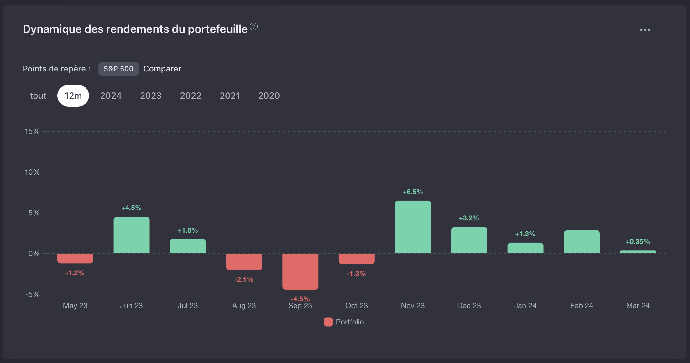 Par rapport à Snowball analytics qui est un très bon outil et sur lequel, je ne peux que recommander à l’équipe de s’inspirer de plusieurs points. Je ne citerai ici que les principaux. Concernant les dividendes, le site permet d’identifier les dividendes à date et les dividendes par rapport au PRU. Il est également possible de visualiser l’évolution de son portefeuille dans le temps et de le comparer à des indices au choix (SP500, N100, CW8…) - cela permet d’un coup d’œil de juger de sa performance. L’outil indique même le montant de l’écart sur la période. Enfin dans les points notables l’outil indique pour le portefeuille le PE, la volatilité, les ratio de sharpe et sortino - en les comparant à l’indice de référence. Cela m’a permis de voir que je suis en dessous de mon indice de référence avec plus de risque.