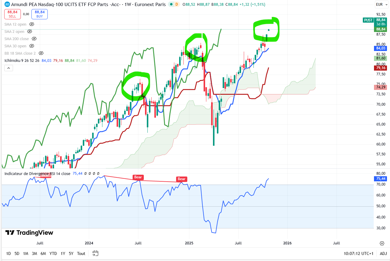 Comme tu peux voir, les cercles en vert sont les plus hauts du NASDAQ 100, si on prend ton résonnement, on ne devrait plus investir une fois que l’indice est trop haut (ATH).