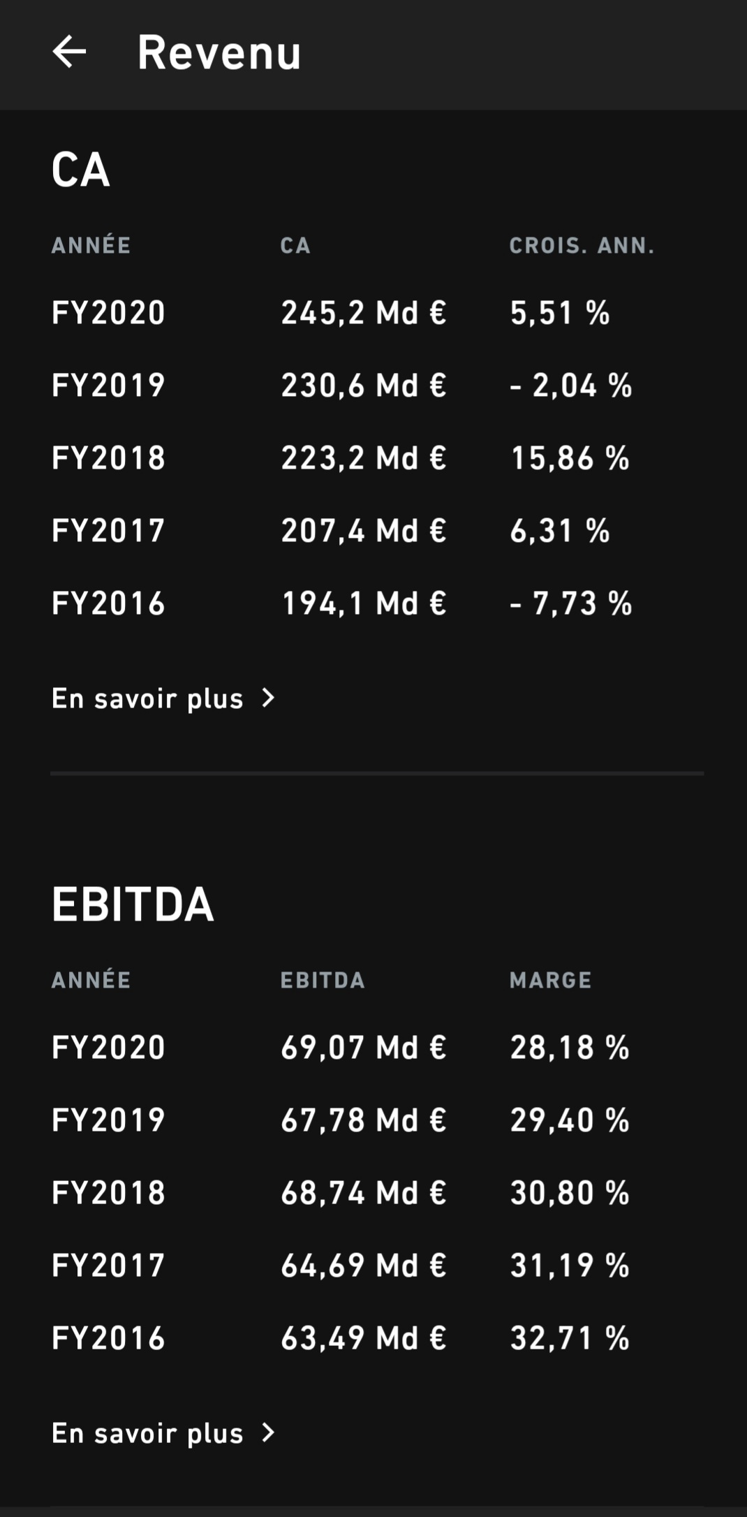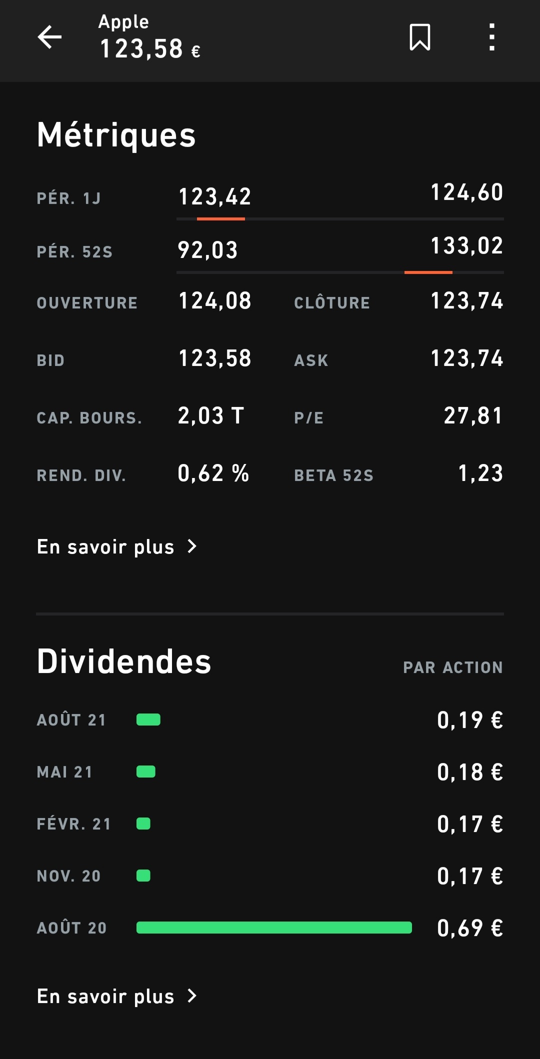 Aussi, vous avez peut ĂȘtre remarquĂ©, mais sur lâapp on a quelques informations supplementaires sur les actions (rendement, calendrier des dividendes, CA / EBIT, reco des analystes etcâŠ)
