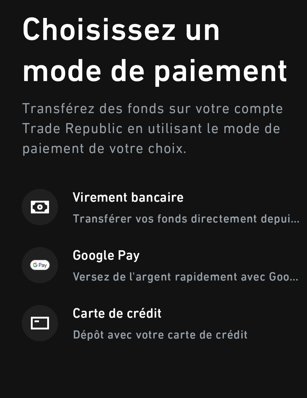 Câest passĂ© inaperçu ou alors jâai ratĂ© le train mais il est dĂ©sormais possible de faire un dĂ©pot via CB ou Google Pay sur lâapp Trade Republic.