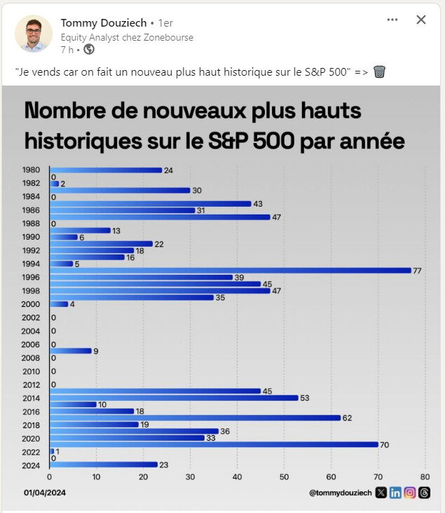 Je viens de lire un article sur MoneyRadar qui donne une stat sur le comportement du SP500 quand il fait des plus hauts.
