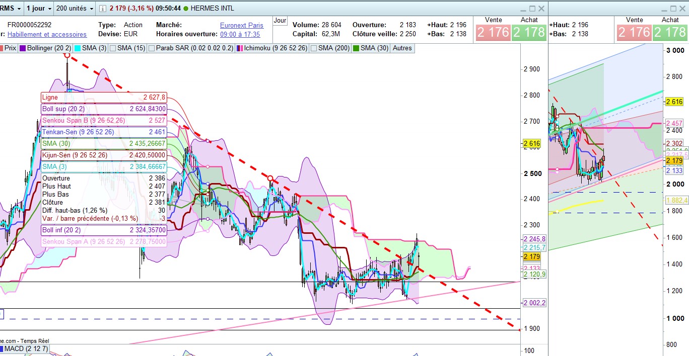 avis perso : je pense qu’elle peut repartir malgré ce qui se passe aujourd’hui. il faut déjà attendre ce soir pour voir comment elle va se comporter aujourd’hui (en fait faudrait toujours acheter le soir en fin de séance) pour voir si elle casse ou non la ligne (sentiment générale sur Hermes que vous connaissez tous) et j’attendrais meme le lendemain pour voir comment sera la chandelle.