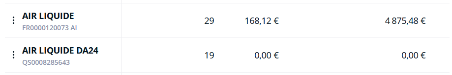 Reçu 4 actions « gratuites » Air Liquide ce jour. Ce qui me fait 48 actions avec un PRU de 121.14€. Ca me fera un peu plus de dividendes l’année prochaine normalement lol.