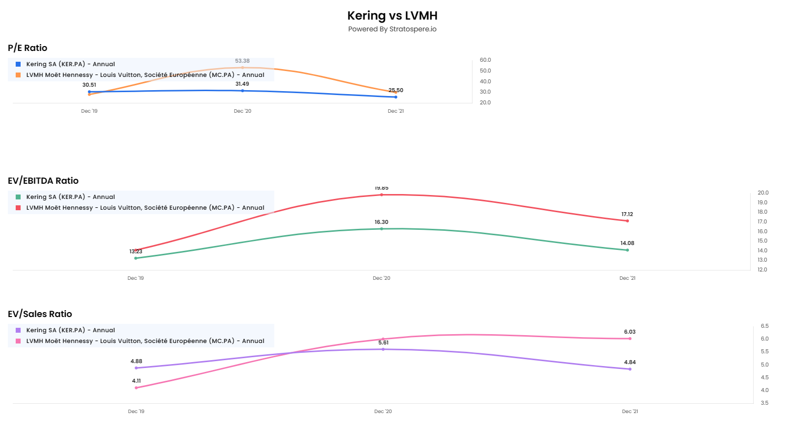 Valorisations relatives pas dĂ©connantes Ă 1Ăšre vue, en déça de LVMH. AprĂšs câest normal quâelle soit « moins valorisé » par rapport au champion du Luxe qui va toujours avoir un premium par rapport aux concurrents de par son statut de leader