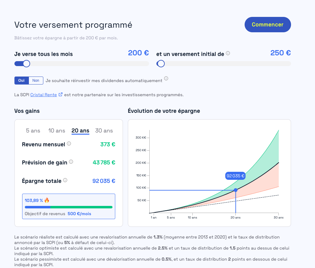 le site est super bien fait, le choix de SCPI parmi les plus importants du marché (57 - mais pas la gamme Corum par contre, tu peux néanmoins les ajouter a ton tableau de bord pour tout suivre du meme endroit) le systeme de cashback marche tres bien et est relativement rapide