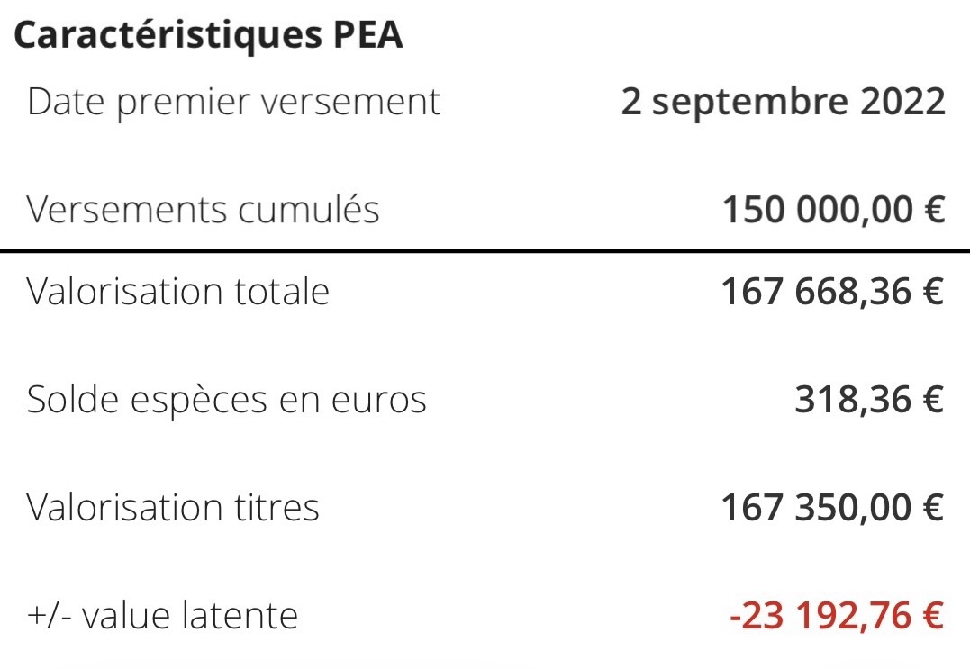 L’ouverture, j’avais mon immo jusqu’à Juillet 2023 donc pas un copec sur le PEA mon ami du coup bah… la baisse est compensée par le dividende, et ne souhaitant pas me séparer de mes actions leur valeur en bourse ne m’importe pas ![]()