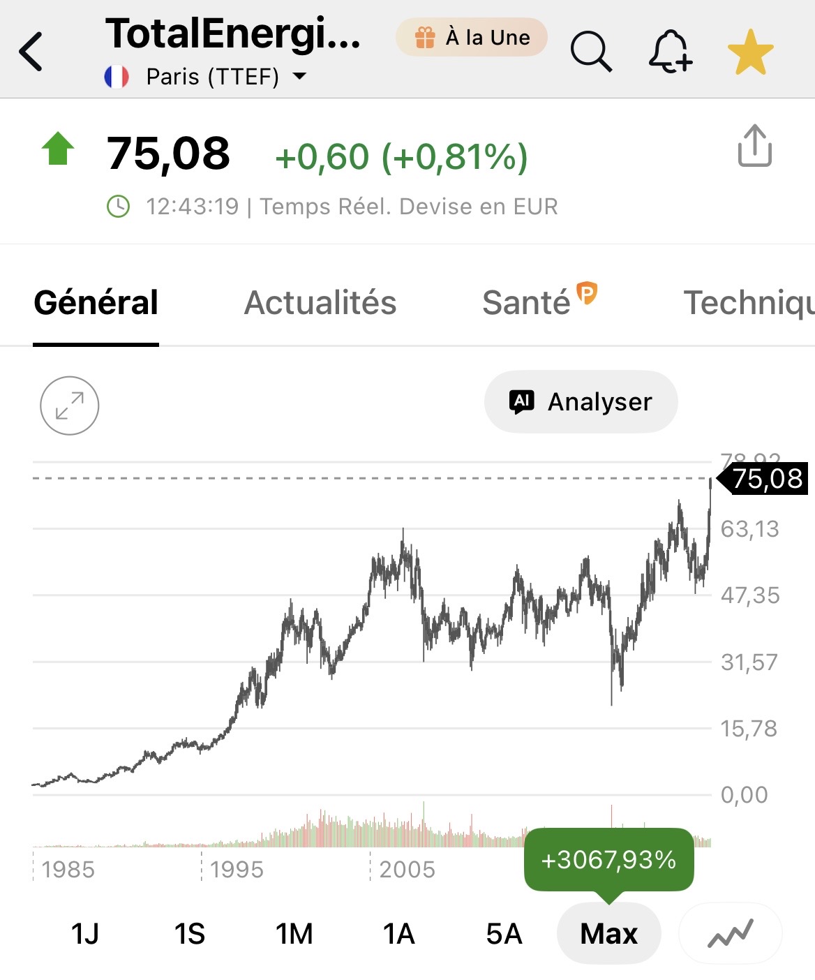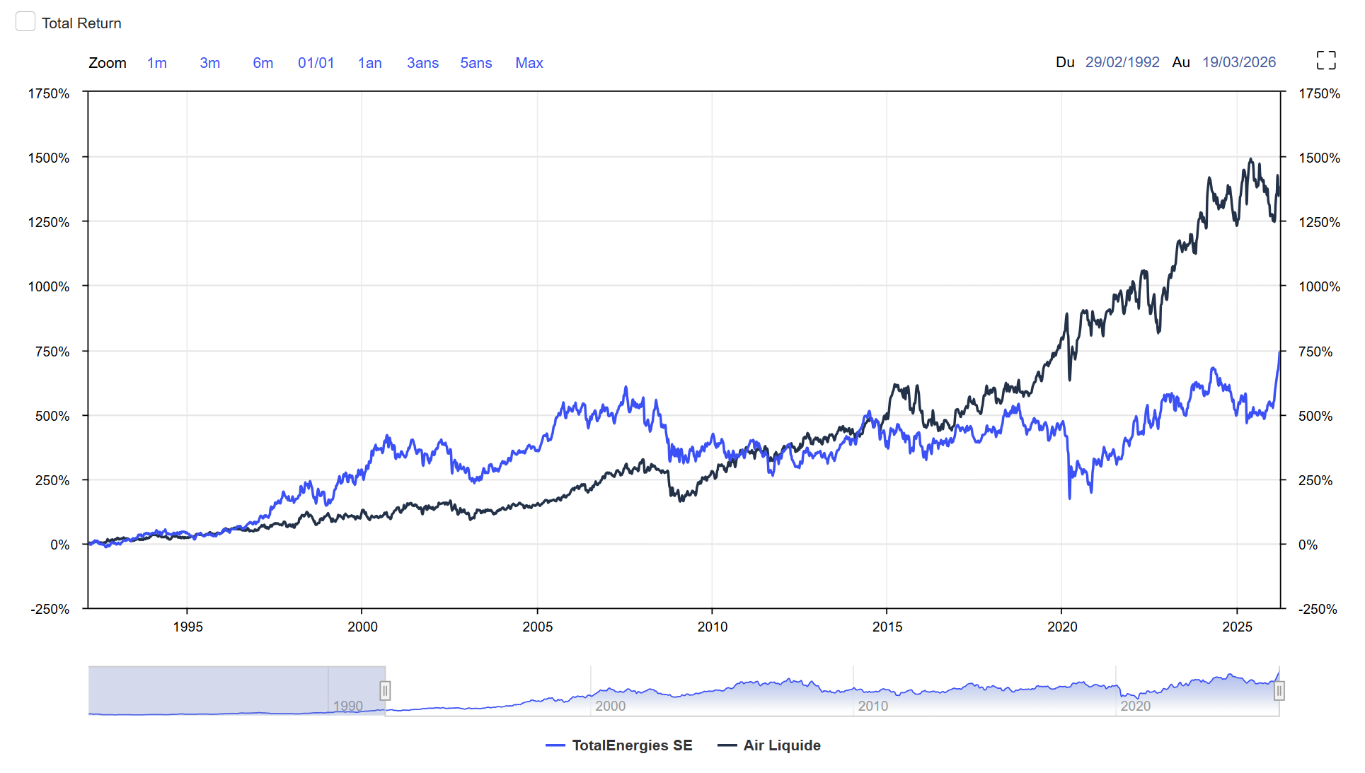 Le total return ne prend pas en compte les distribution d’actions, je te laisse imaginer en les intégrant depuis 1995, franchement c’est une folie, chez Air Liquide on peux au bas mot tripler le graph visible pour quelqu’un qui aurait conservé les titres supplémentaires, et je n’exagère pas.