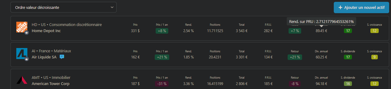 @mathieu.bernier @florianp : j’ai rajouté le Rendement sur PRU pour chaque ligne, pour l’instant sous forme de tooltip au survol du dividende.