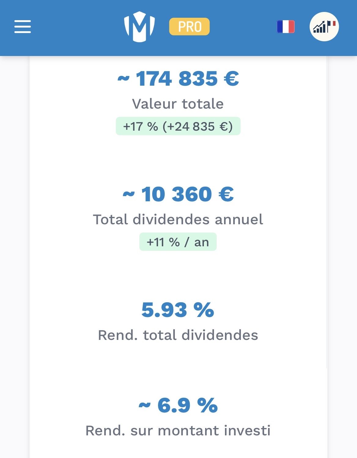 Je vois ce que tu veux dire. De mon côté j’utilise l’option de simplement mettre o€ de PRU à tout ce que j’ai acheté via mes gains et dividendes, du coup ça tombe juste avec 150k€ investi et 24,835k€ de gains ![]()