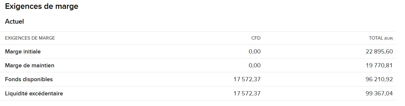 Marge de maintien (19 770,81 EUR) : Là , on parle du minimum nécessaire pour garder tes positions ouvertes. Si tes fonds descendent en dessous de ce niveau, tu risques la liquidation (en gros, certaines positions seraient fermées pour éviter un déficit).