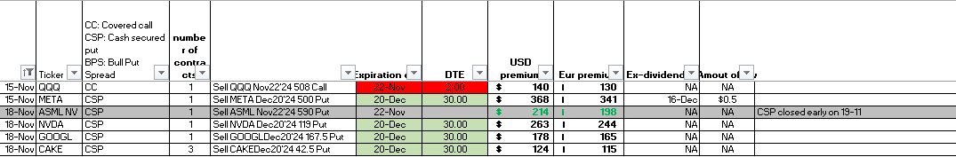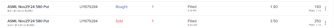 Sinon j’ai aussi tradé ASML comme quasiment chaque semaine et j’ai fermé le trade hier avec un joli profit(vente de PUT sur les 590euros a echeance le 22/11).