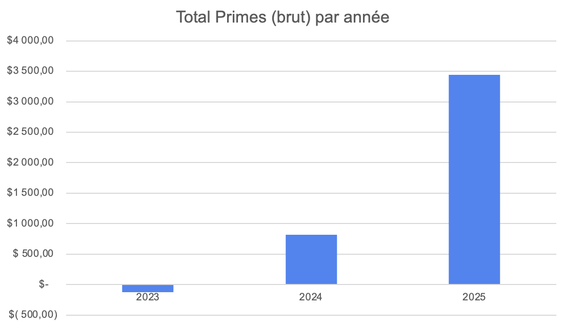 En perspective, voilĂ les primes perçues depuis que jâai commencĂ© en septembre 2023 :