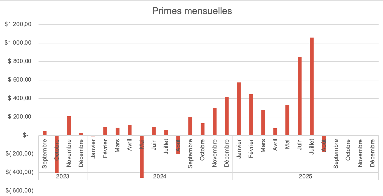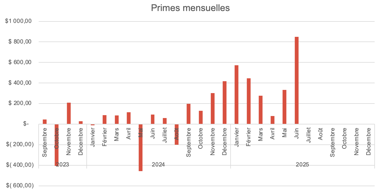 Je pense que je commence Ă bien gĂ©rer mon risque et mon allocation de capital, on est bien parti pour lâobjectif des 300 $ par mois en moyenne