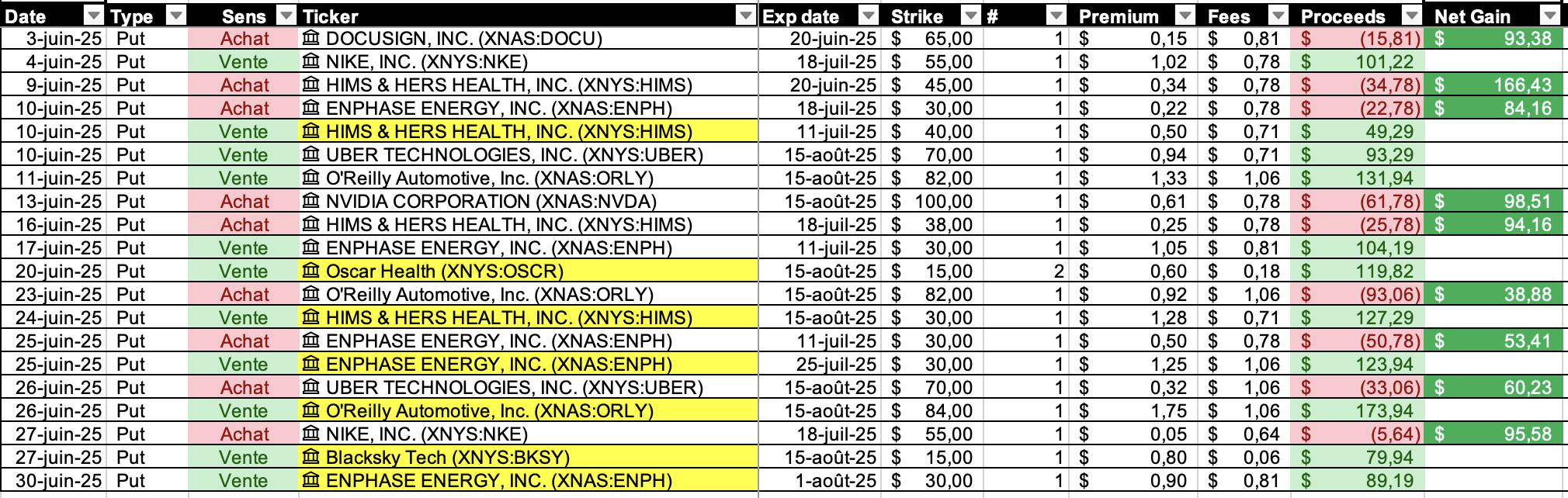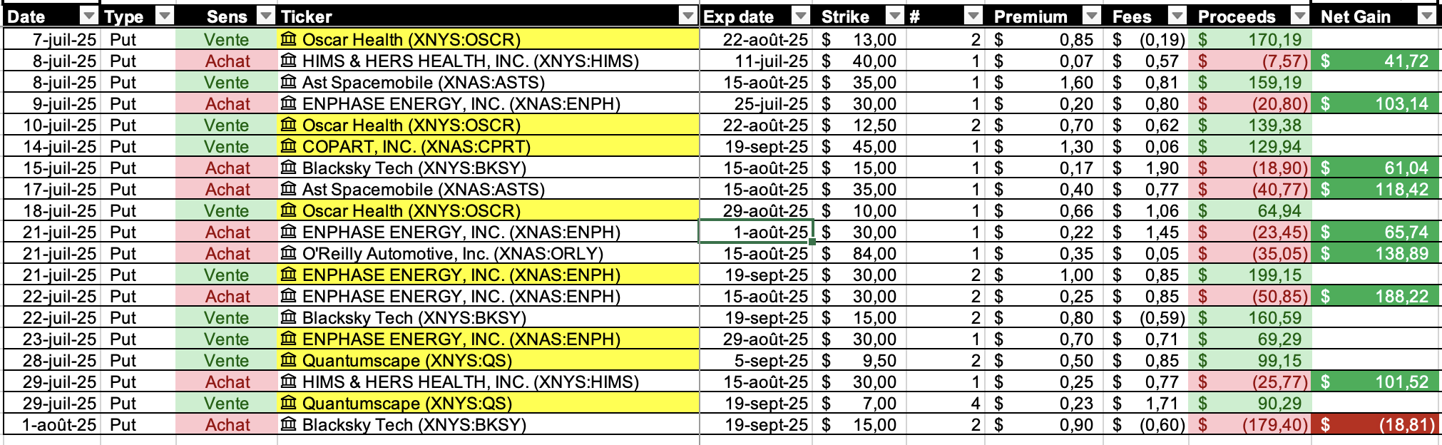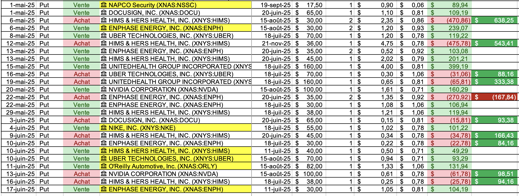 RĂ©cap des transactions (en jaune : les options encore ouvertes, en plus de 2 autres puts sur Napco $NSSC et Oscar $OSCR qui nâapparaissent pas ici)