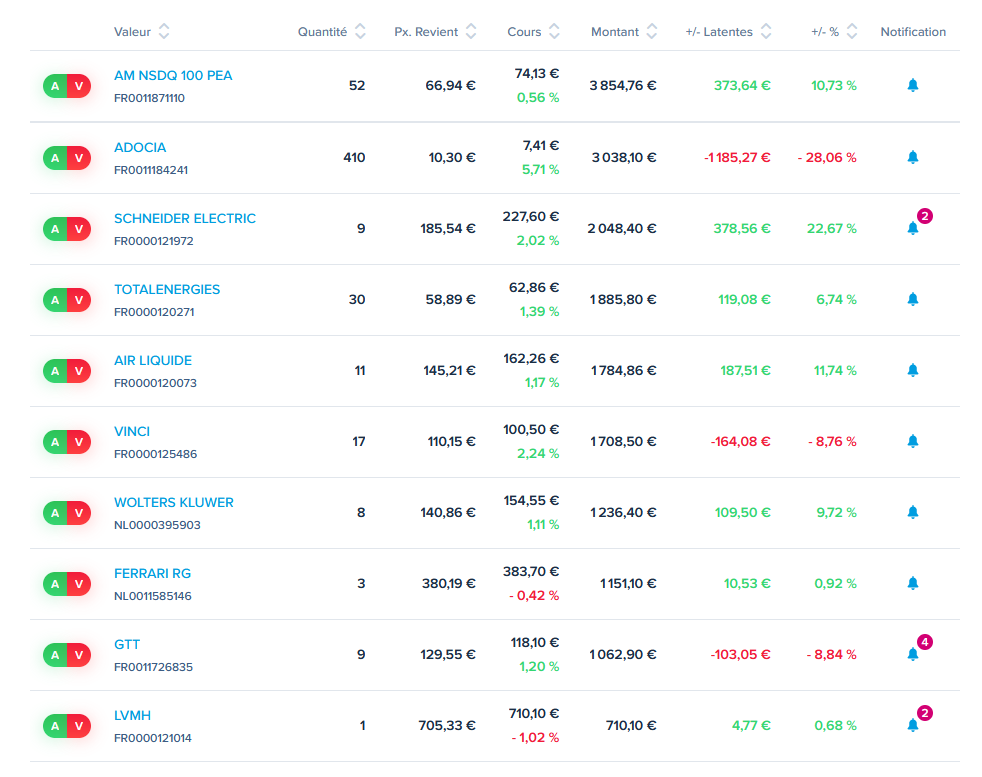 Je m’en tiens à mes convictions sur les valeurs qui ont une tendance haussiere, le reste j’ai largué petit à petit (airbus, stellantis, LVMH) même si j’aurai pu faire une bien plus belle PV dans le passé OU dans le futur, tant pis