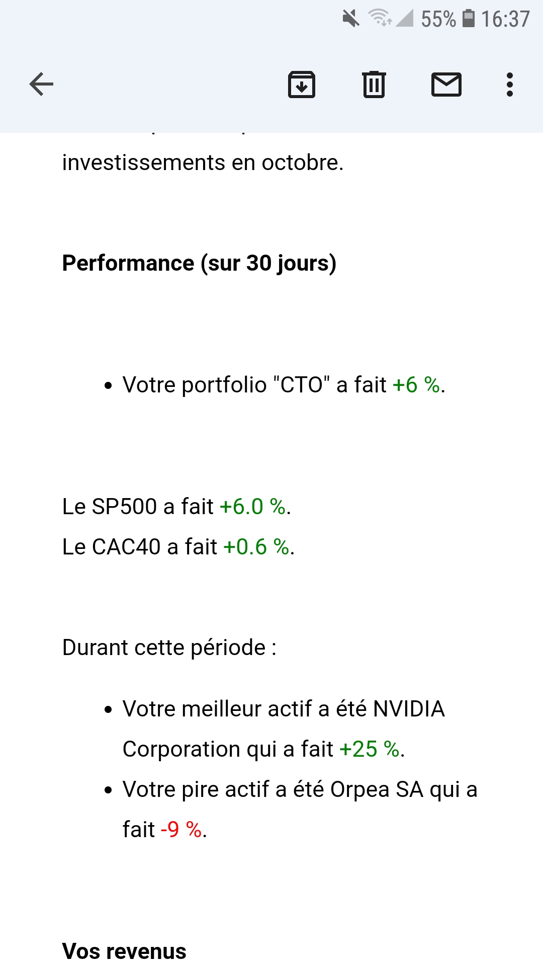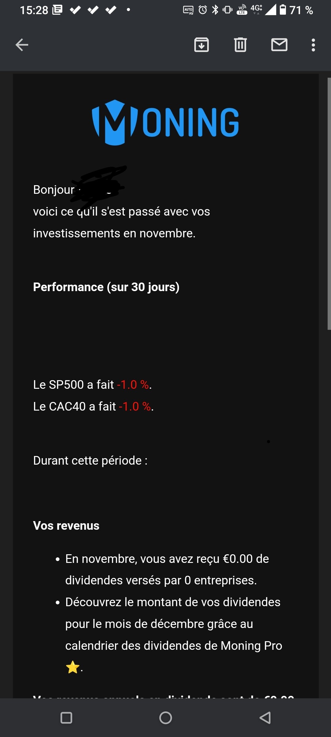 oui bien recu super d avoir un récap du mois , par contre on me dit que j ai touché des dividendes au mois d octobre j ai rien recu