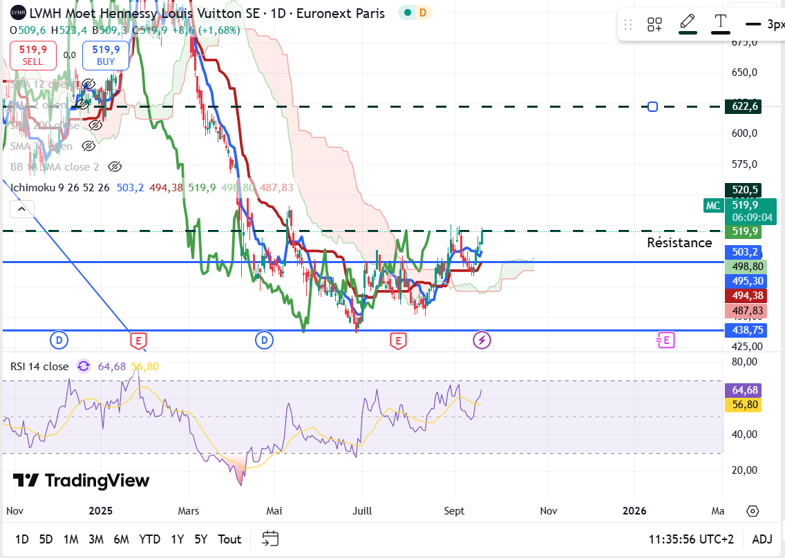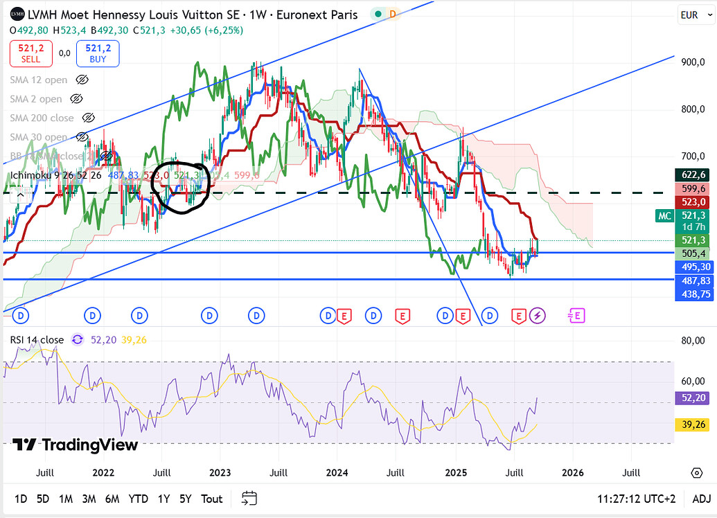 Pour LVMH en dayli (court terme) : Nous sommes dans une phase haussiĂšre, tous les indicateurs dâichimoku sont dans le vert (positif), le prix Ă casser le nuage, la kijun et tenkan ont croisĂ© (ligne rouge, ligne bleu), la lagging a aussi cassĂ© le nuage.