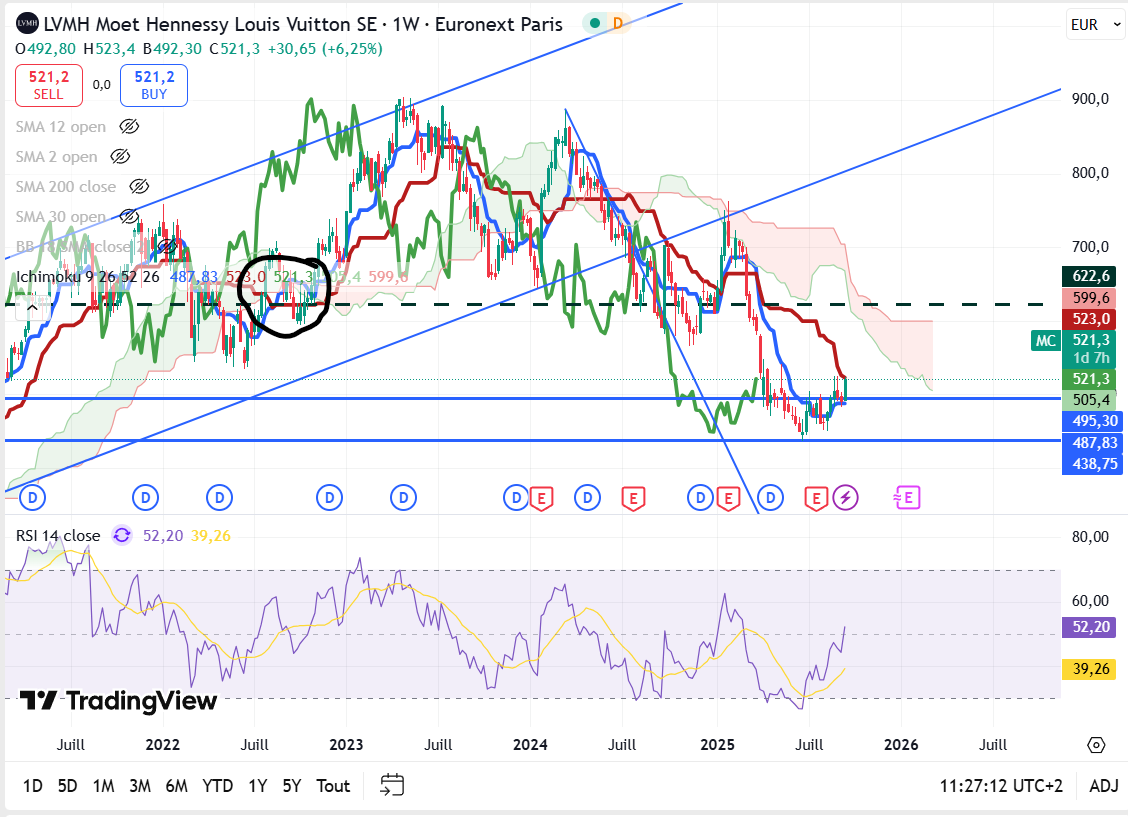 Pour LVMH en WEEKLY (moyen terme), on est toujours en phase baissiÚre, tous les indicateurs sont négatifs. Le prix vient de toucher la Kijun (ligne rouge), donc il est possible que le prix revienne vers la tenkan (ligne bleue) vers 488. La kijun et tenkan commence à se rapprocher (changement de tendance ?)