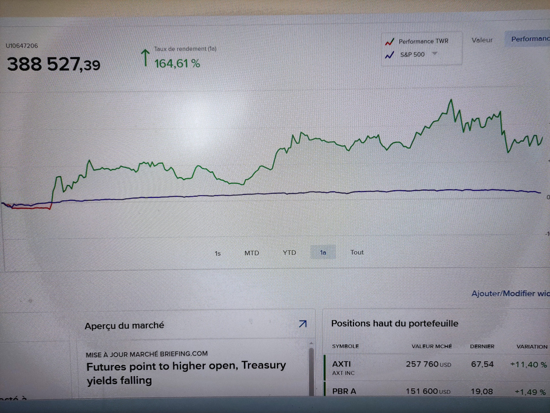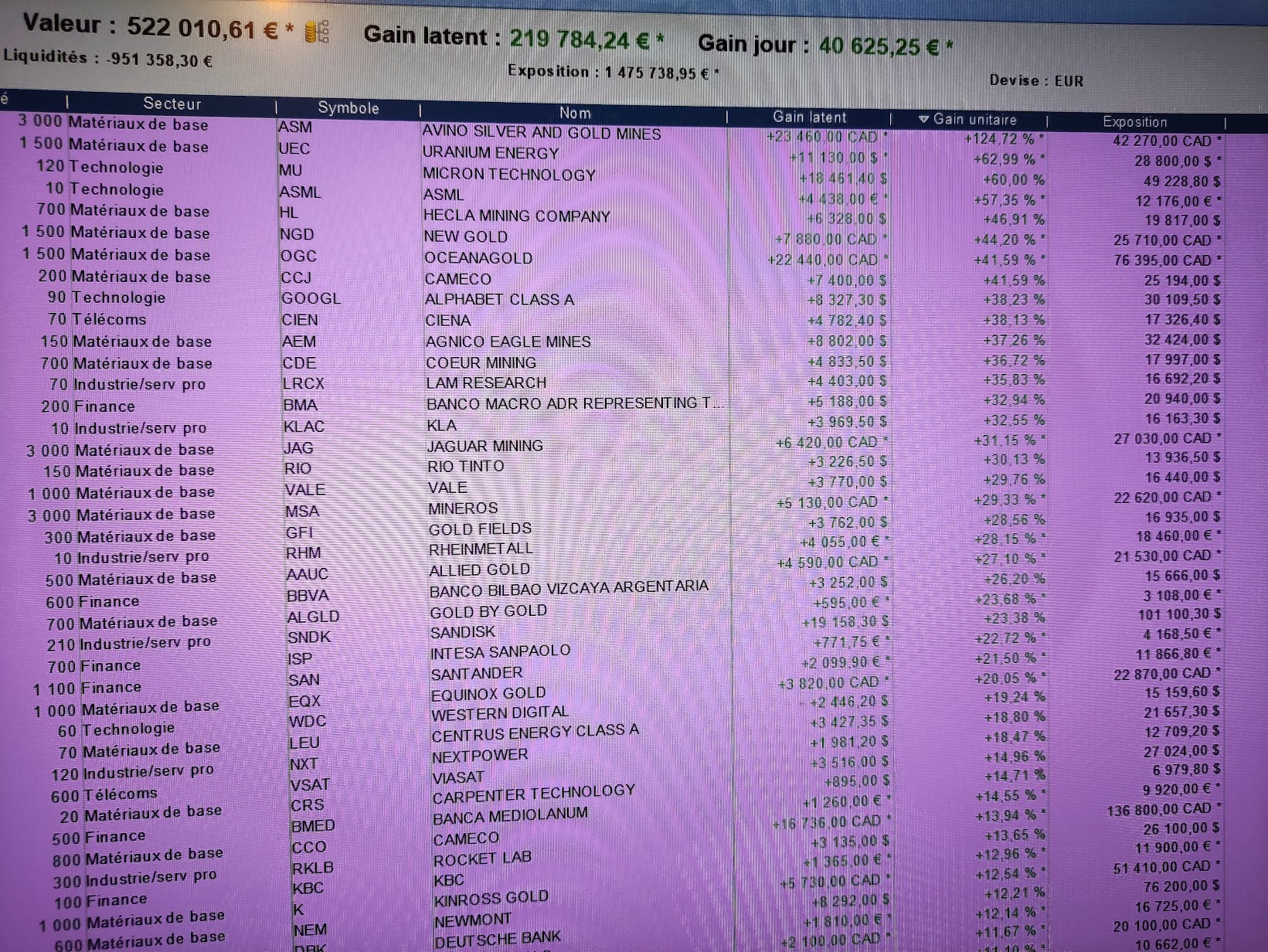 Je pense qu’il y a des cycles, des vagues impulsion, suivie de vagues de correction et le problème, c’est que toutes les actions qu’il a choisie sont au plus haut, il fallait les acheter il y a 10 ans. Elles font toutes des plus bas de plus en plus bas et des plus haut de plus en plus bas. Depuis 10 ans, je ne gagne rien, Le mental, la psychologie, se fixer des règles, c’est simple, mais il ne faut pas douter de sa méthode. je ne gagne que depuis 2025. Je te joint un graphique le plus haut c’était le 28 janvier 2026, j’aurais du tout vendre plus 269 %, depuis plus 164 %, je suis revenu à mon bénéfice de décembre, à cause de Trump, j’ai vendu toutes mes mines d’or et je viens d’acheter du pétrole et du gaz. Tu voie, je pensais que Romain, allait me demander mon avis, c’est pour cela que j’ai écrit, je suis un grand rêveur.