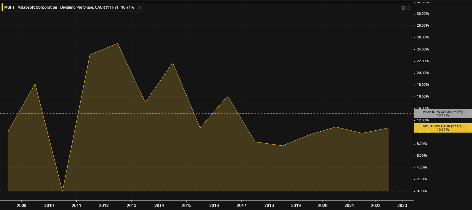 Ex sur Microsoft, taux de croissance annuel du dividende, en Y/Y sur les 15 dernières années : moyenne de + 13,12% !
