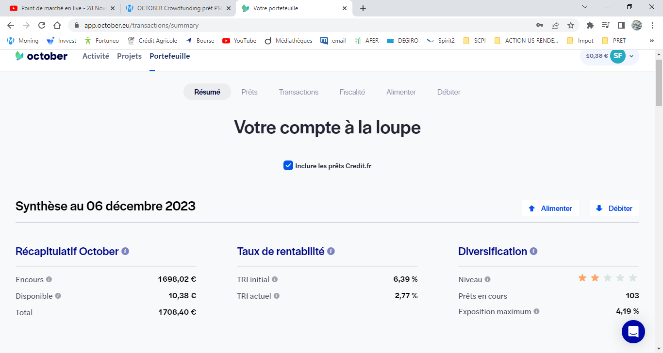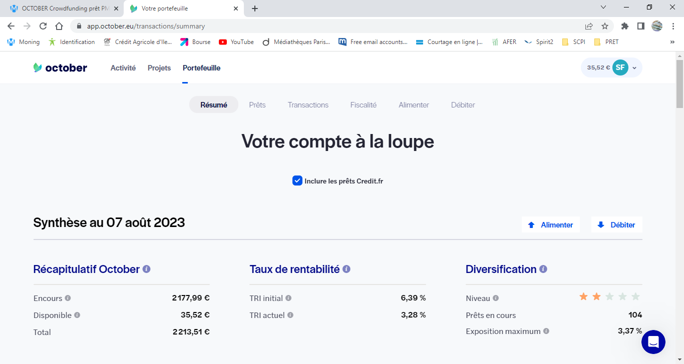 Je nâai pas encore ouvert de ligne dâinvestissement sur October et je commençais Ă mây intĂ©resser, tout comme Ă Mintos, mais je pense que je vais passer mon chemin. ROI pourri + charge mentale = Ă dĂ©gager !