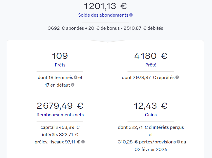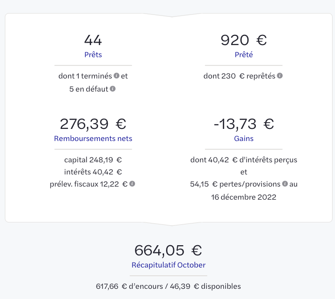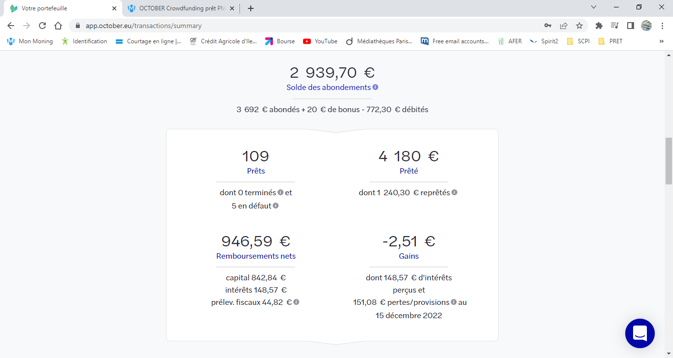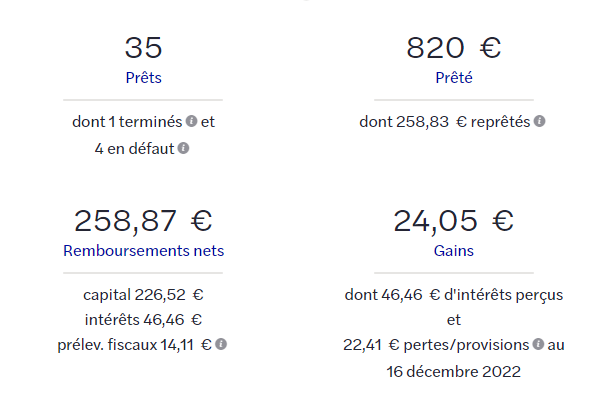 Jâai investi que pendant 6 mois sur 109 prĂȘts pour tester, dĂ©but 2022.