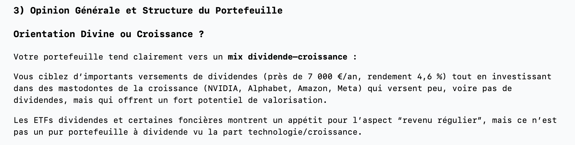 Je lis souvent lâĂ©tude de mon PF par lâIA Moning. Câest instructif et les conseils pertinents (mĂȘme si je ne les suis pas). En ce moment, il ne me propose plus dâinvestir dans la SantĂ© (ce nâest pas ma tasse de thĂ© et je nâai que Novo Nordisk). Les analyses changent Ă chaque fois, ce qui me plait bien ; il donne mĂȘme parfois des encouragements ou des âbons pointsâ âŠ