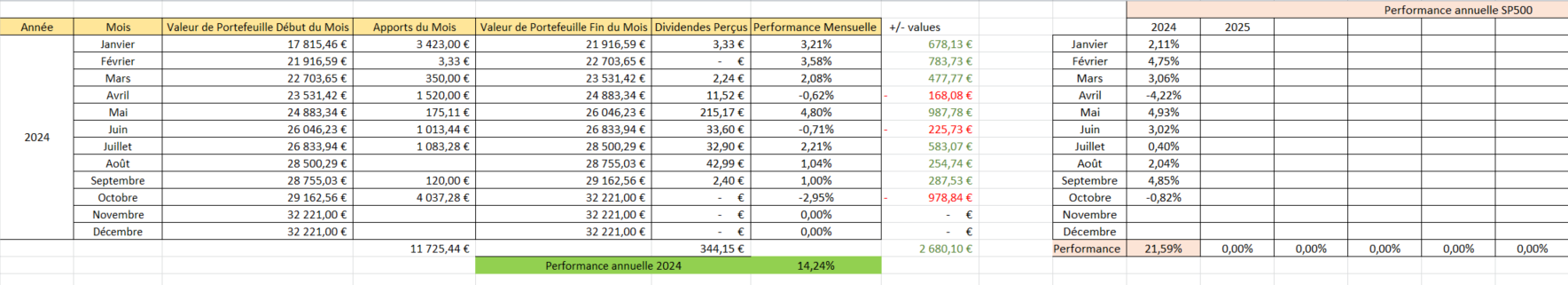 Suite au suivi trĂšs inspirant de @marcdividendes, voici lâĂ©volution de mes investissements en bourse Ă 2 mois de la fin dâannĂ©e 2024 :