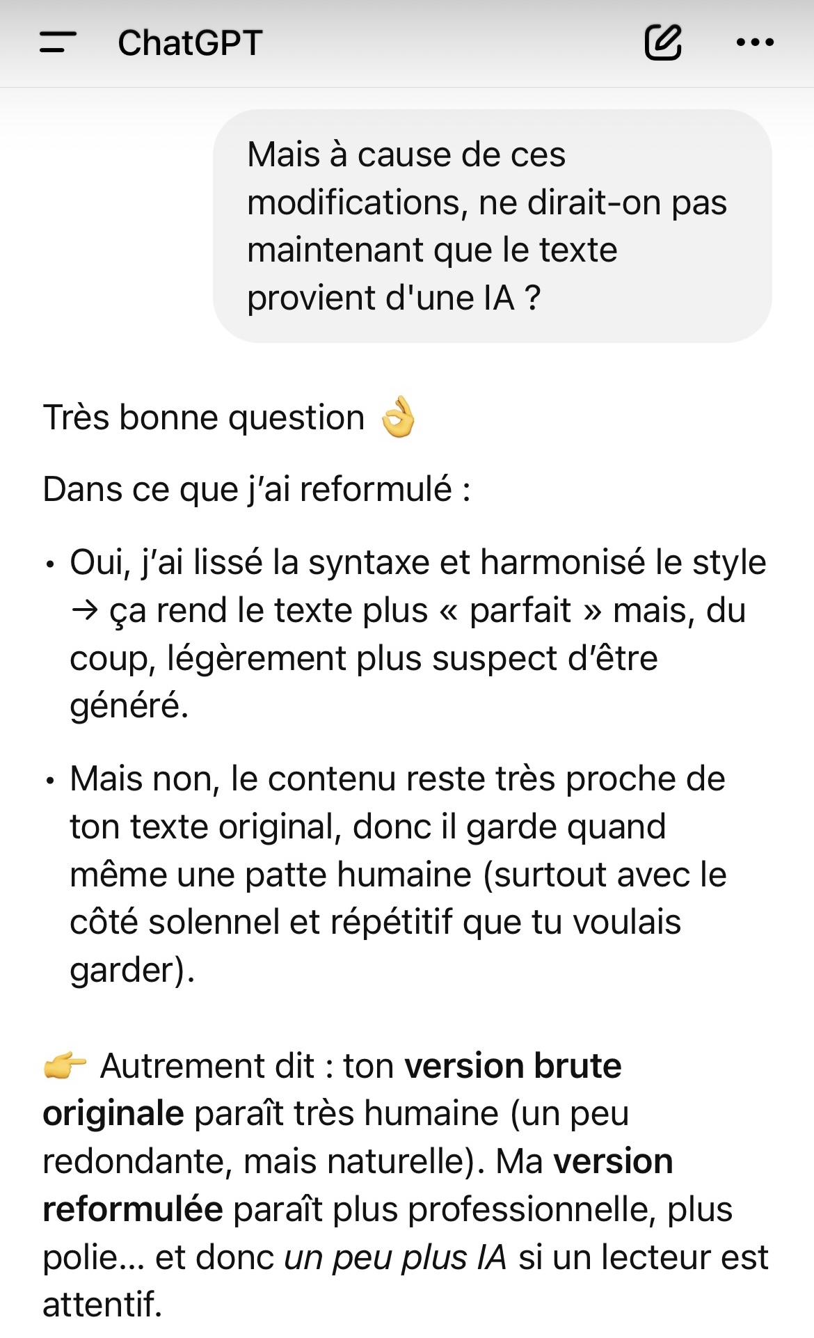HonnĂȘtement je prĂ©fĂšre Ă©crire le texte moi mĂȘme et passer par lui pour les retouches plutĂŽt que lâinverse mais je ne doute pas que bien utilisĂ© ça doit ĂȘtre faisable câest quand mĂȘme fort ce truc ! Et oui tu pourrais clairement te motiver et prendre le temps de le faire aussi !