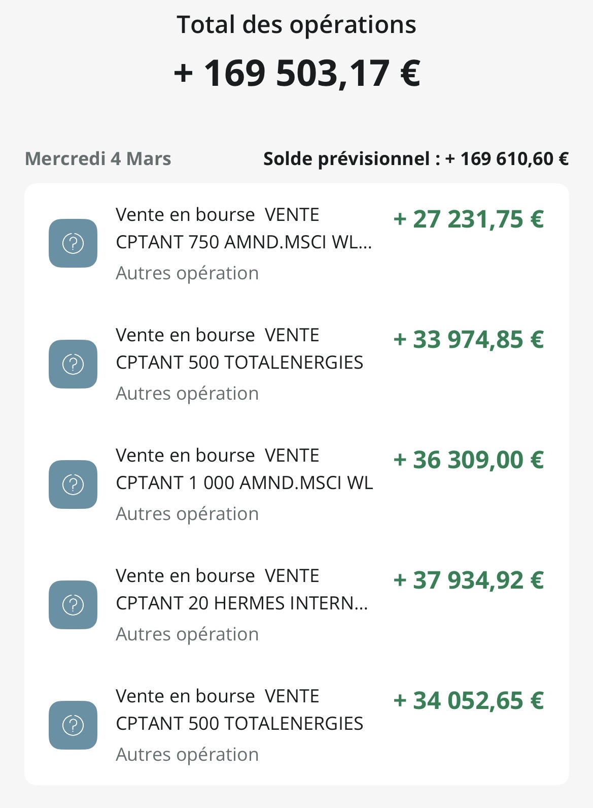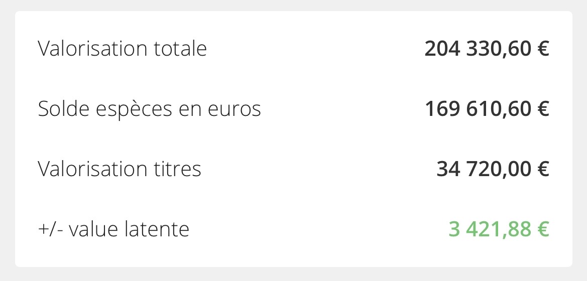 Bon, et bien aprĂšs une nuit de rĂ©flexion, jâacte 12 000⏠de PV latente sur les 16 000⏠qui Ă©taient en cours pour repasser en cash. Je ne rerentrerais peut ĂȘtre pas de si tĂŽt sur mes lignes favorites, mais mon PF Ă©tant Ă 3000⏠de son plus haut niveau je trouve dommage dâĂȘtre autant Ă la merci du marchĂ©, de Trump et des rebonds digne des Simpsons. Je repasse donc en quasi full liquiditĂ© afin dâavoir des billes pour ce qui sera le plus malmenĂ© prochainement.