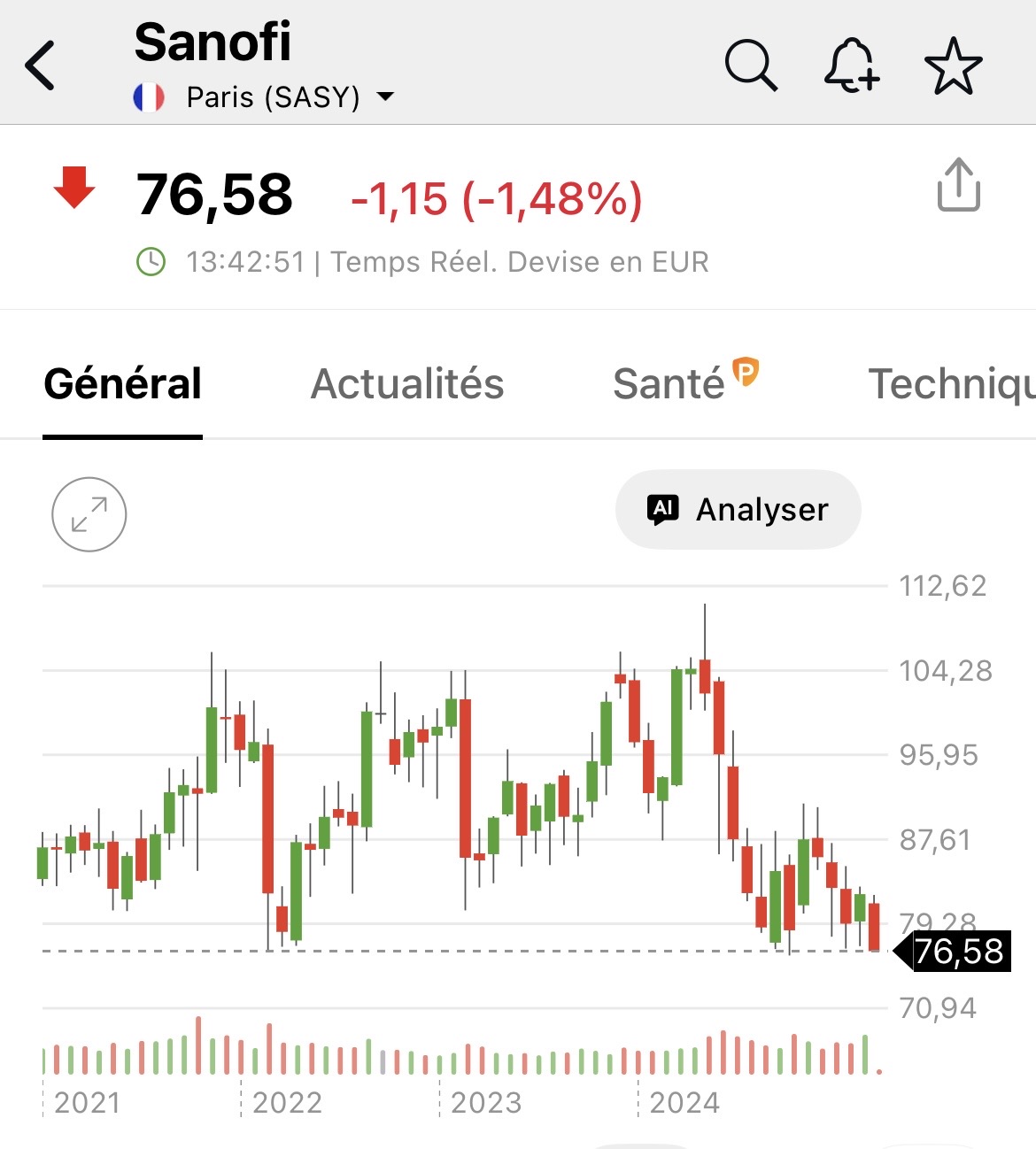Tu mâa fais une fausse joie Mick, en gros y a que Sanofi qui baisse quoi, puis bon quand jâai Ă©cris ça au final elle Ă©tait Ă 78⏠donc jâespĂ©rais quand mĂȘme une chute plus sympa mais jâadmet que ça commence Ă bien baisser pour elle quand mĂȘme ![]()
