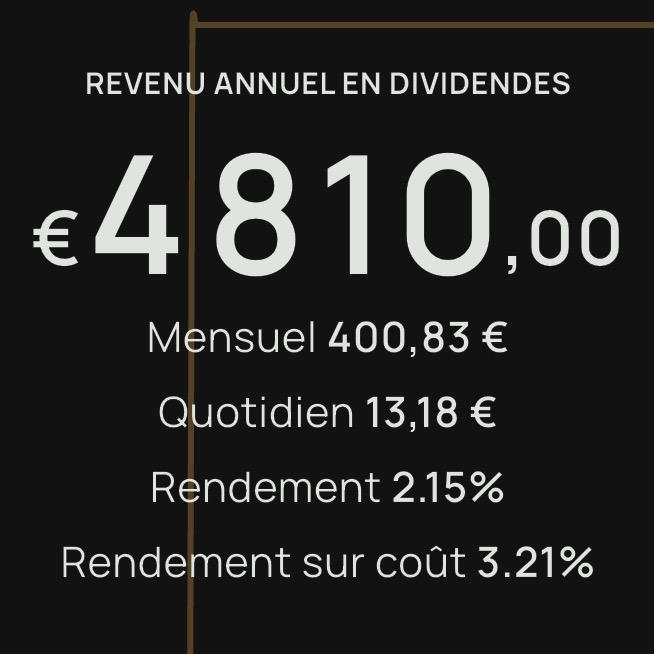 Question de Capital Ă disposition dans mon cas, avec leur augmentation de dividendes actuelle, ça me fais 400⏠par mois Ă retirer ce qui me suffis. Mais avant dâavoir encaissĂ© 50 000⏠de PV, et quand lâaction Ă©tait plus haute avec en plus un dividende Ă 3,20⏠par actions contre 3,70⏠actuellement jâaurais mĂȘme pas eu 300âŹ/mois avec un All-In et ça change quand mĂȘme pas mal la donne dans mon cas, ne pas oublier que je suis au Smic donc 100⏠de plus par mois, câest 100⏠de plus ![]()