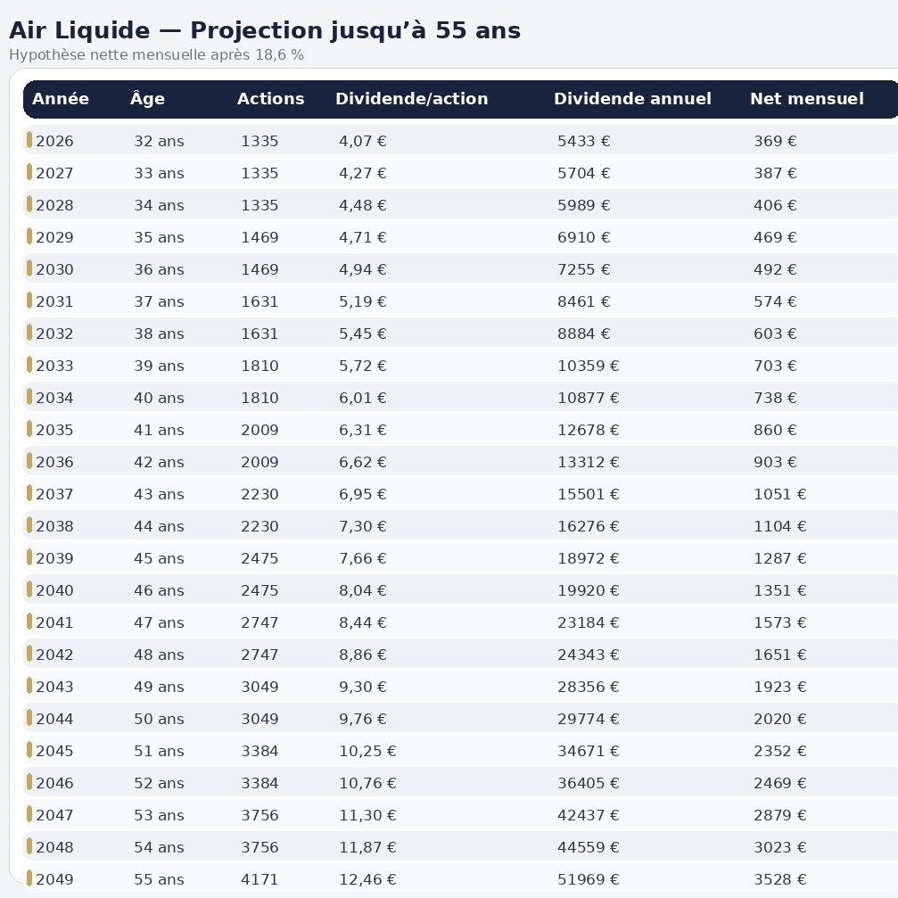 Moi je me demande mĂȘme pourquoi je me ferais chier Ă vendre des air liquide pour autre chose quand jâai les gratuites quand je fais des simulations mĂȘme pessimiste avec un dividende Ă +5% par ans contre historiquement +8%