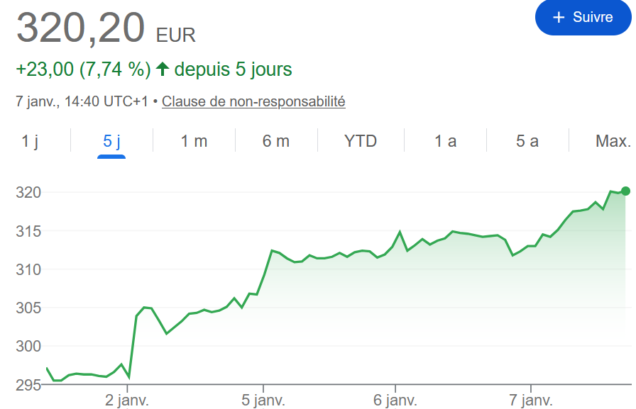 On est presque dans du FOMO la une partie de mes actions issues de plan d’épargne salarial a été vendu a 311€ (environ 30 actions), le reste sera vendu lors du retrait de l’argent du plan d’épargne. Mine de rien 10€ de plus c’est environ 600€ de plus en apport