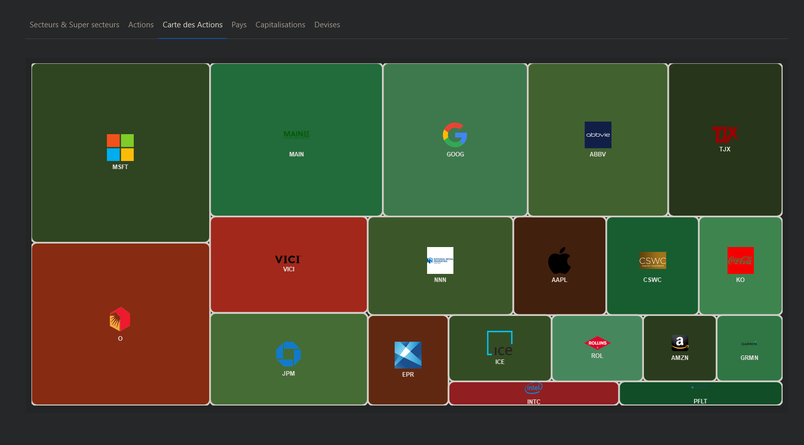 Orientation vers les dividendes : Lâinclusion de sociĂ©tĂ©s comme Realty Income Corp, Main Street Capital Corporation, et plusieurs sociĂ©tĂ©s immobiliĂšres (REITs) comme VICI Properties Inc, National Retail Properties Inc, et EPR Properties indique un fort accent sur les revenus passifs rĂ©guliers. Ces entreprises sont bien connues pour distribuer des dividendes de maniĂšre constante, ce qui est typique des portefeuilles axĂ©s sur le revenu.