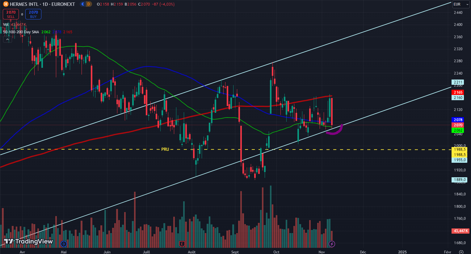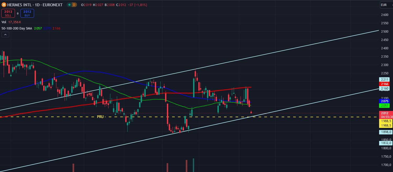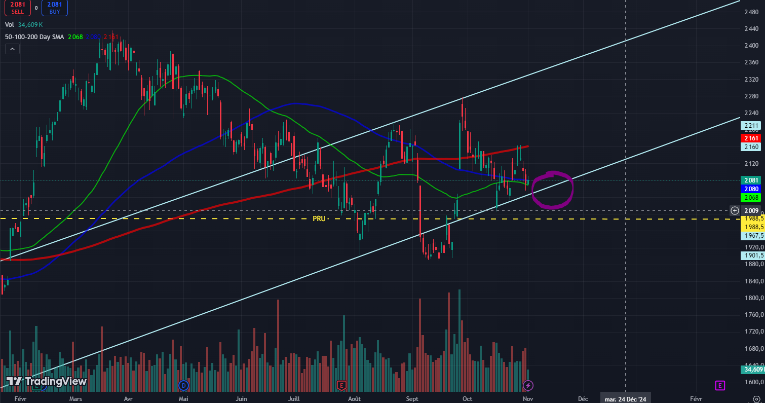 Aussi, nous approchons un gros support sur les ~2000 €. Si jamais celui-ci est percé, je dirais que nous entrerons dans une phase de latéralisation du cours, à la manière de LVMH.