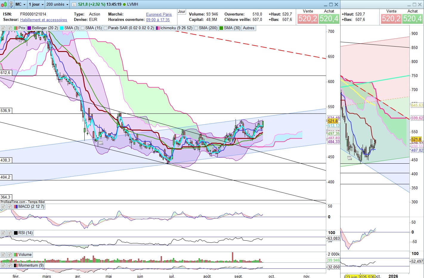 le macd est positif mais sans plus, le RSI est a 63 donc plutot en zone dâachat, et le momentum positif.