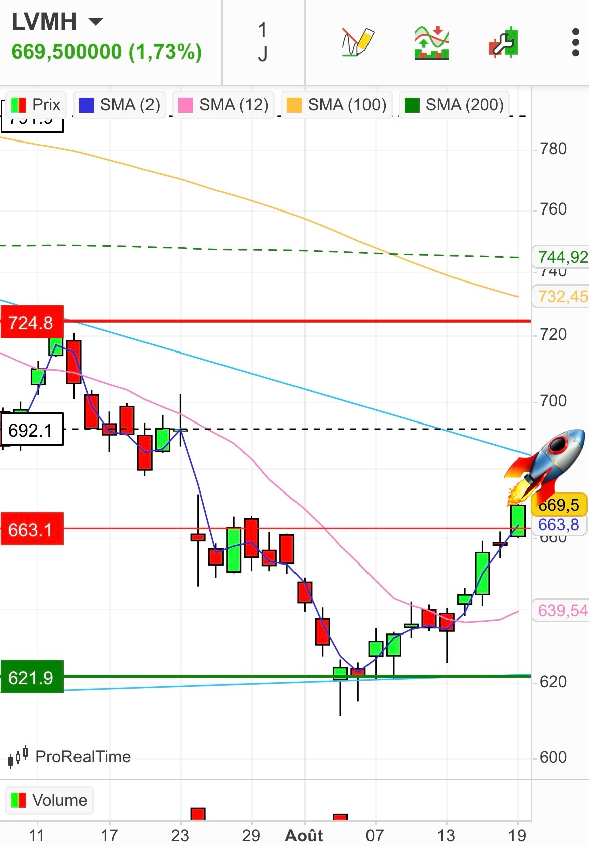 Hum, je dirais que dâaprĂšs lâanalyse technique du graphique : la rĂ©sistance Ă 663⏠a fait barrage Ă la hausse et donc on pourrait assister Ă un repli sur le support Ă 621⏠ou un nouveau test de la rĂ©sistance la semaine prochaine. Pression baissiĂšre avec oblique descendante. Attention car le graphique est en journalier.