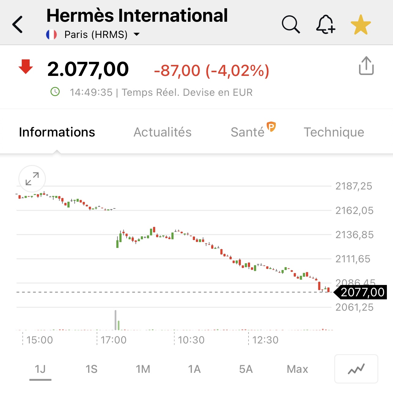 A mon avis, si on a aucun titre, câest pas le moment dâacheter du luxe français pour quâil performe, Ă part un Hermes en mode defensif dans un pf