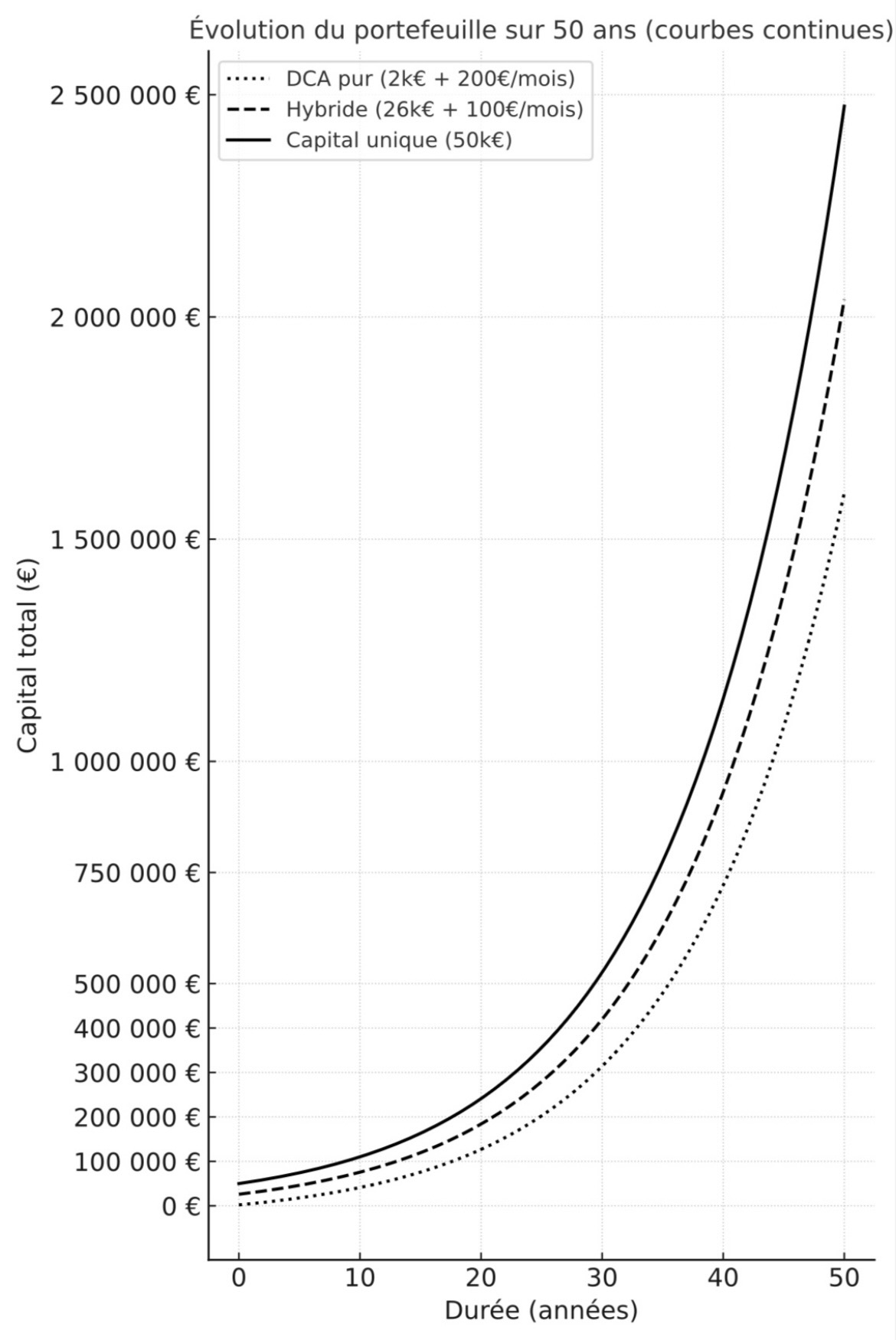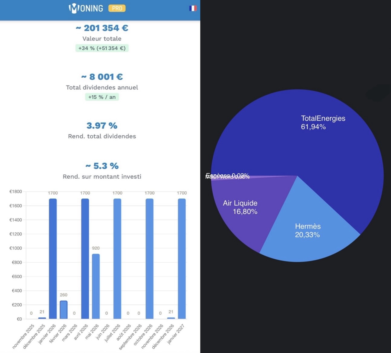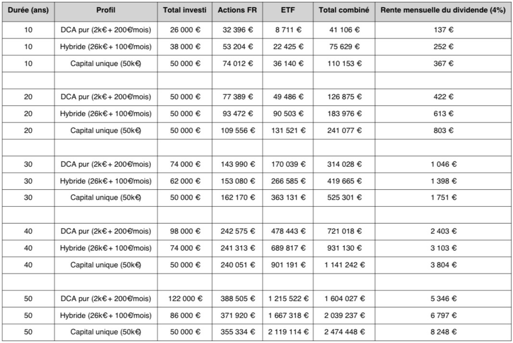 L’idée est d’avoir une base plutôt orientée revenus (dividendes) tout en gardant une poche capitalisante pour la croissance à long terme.