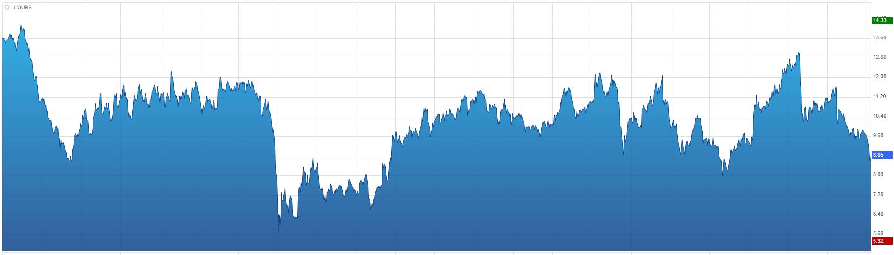 Jâen ai repris une petite louche Ă 8,50⏠hier pour faire baisser mon PRU⊠10,22 chez moi. Je vais mettre mon cash sur dâautres actions les prochaines semaines et jâen reprendrai encore petit Ă petit si on reste sous les 9âŹ. Pour le moment câest 9% de mon portefeuille donc je cherche Ă baisser un peu.