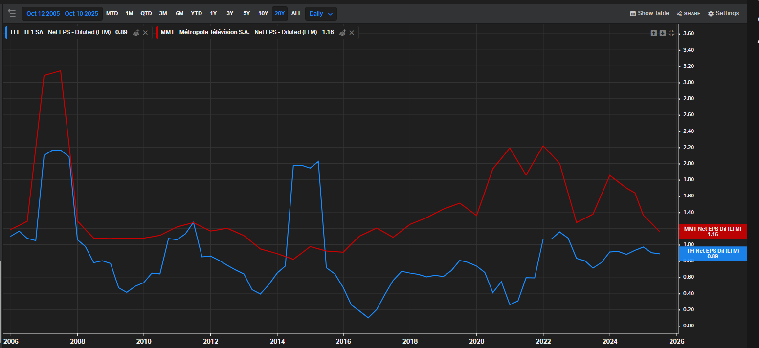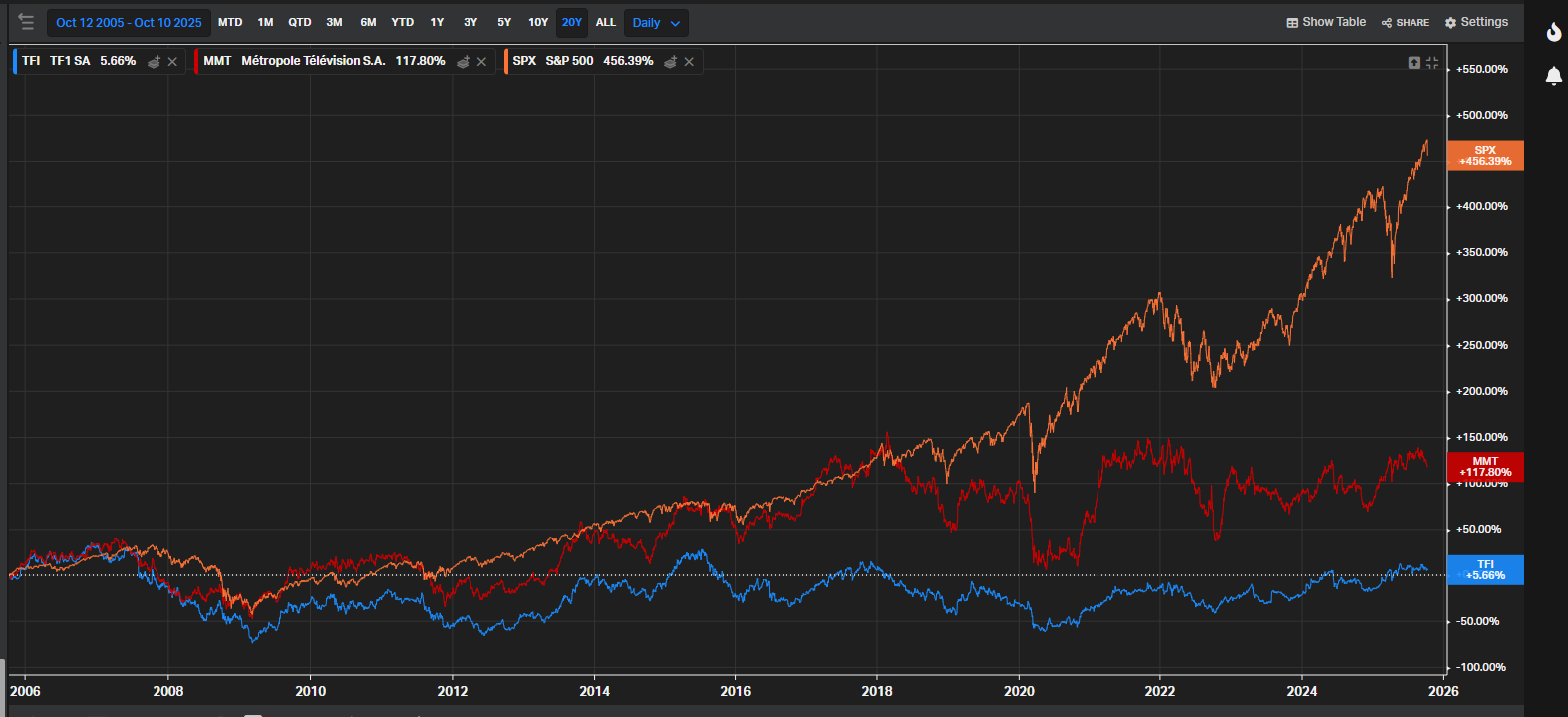 En 20 ans, Tf1 à fait du sur place complet. Autrement dit une perte nette d’argent en tenant compte de l’inflation, voire même du cout d’opportunité. M6 à réussi à faire un petit +115%, bien ridicule face à ce que le marché américain a fait pendant ce temps (+456%)…