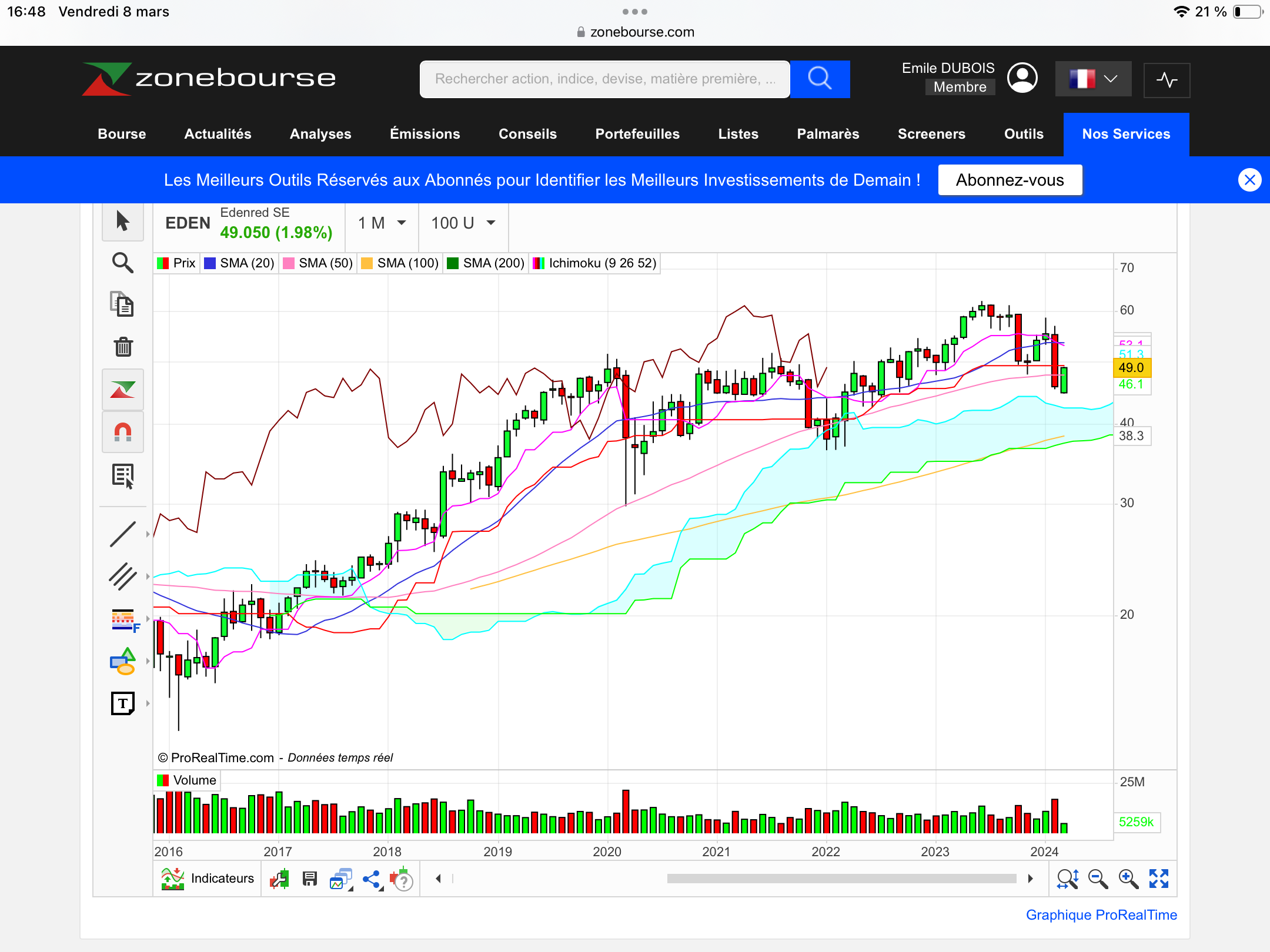 Belle semaine pour tout le monde j’espère. Bon je viens d’ouvrir une ligne Edenred. 20 titres. L’ichimoku est positif. Tendance haussière de long terme et fondamentaux de la boîte excellents. A suivre.